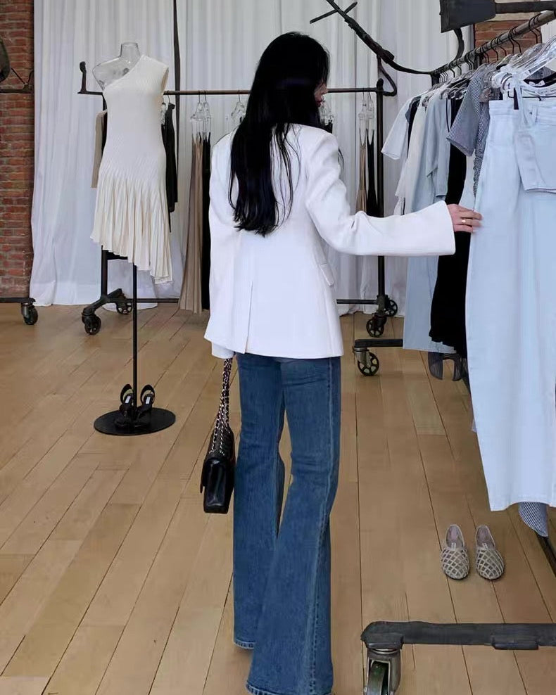自然な立体感とウエストを絞りすぎないストレートラインで、タックパンツやデニムにも合わせやすく、オフィスや会食、綺麗めデートにもおすすめです。