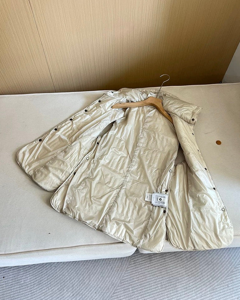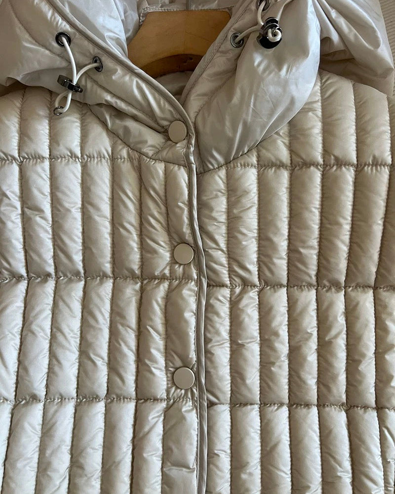 フード付きのロング丈・軽量ダウンベストです。秋〜冬の立ち上がりまで使える薄手タイプで、ウエストベルトでシルエット調整できます。サイドのスナップボタンはニットや薄手のスウェットを着た時も窮屈にならず、シーズンによっても調整できます。