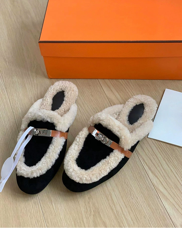 外側はスエード調シープスキン、内側はふわふわの羊毛ボアが一体化したリアルレザー・ムートン仕様。暖かく高級感があり、秋冬のリラックスコーデやワンマイル外出にもぴったりです。